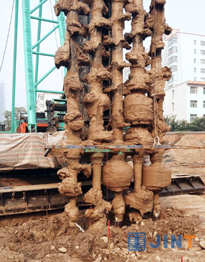 其次,使用ZKD85-5可大大降低水灰比的同时解决了水泥浆外溢造成的浪费。三轴钻机采用螺旋叶片,下钻时叶片的负载较大,只能通过增大水灰比来降低负载。通常,三轴钻机搅拌施工时的水灰比为1.5-2.0,水泥用量高达到20%,而实际有效用量只有13%左右,容易造成水泥浆外溢和浪费。ZKD85-5施工时水灰比降为0.8,而且水泥能全部搅拌在土层中,施工成本明显降低,同时还解决了水泥浆污染、外运的烦恼。此外,钻头的改进有效增强了设备入土切削的能力。