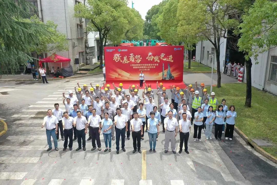 6月20日上午11时,“2023上海金泰海外市场批量交付发车暨服务保障团队出征仪式”于上海安亭洛浦路45号金泰本部隆重举行。一辆辆满载主机、附件和钻具以及现场保障用品备件的卡车从金泰本部驶向港口,奔赴中东、北美、澳洲、南亚、俄罗斯等国家和地区,为上半年的收官工作再敲重锤。上海金泰总经理黎隶万、党委书记陈雪英、董事副总经理徐峰等公司主要领导以及生产、研发、营销等各部门代表共同参加见证。