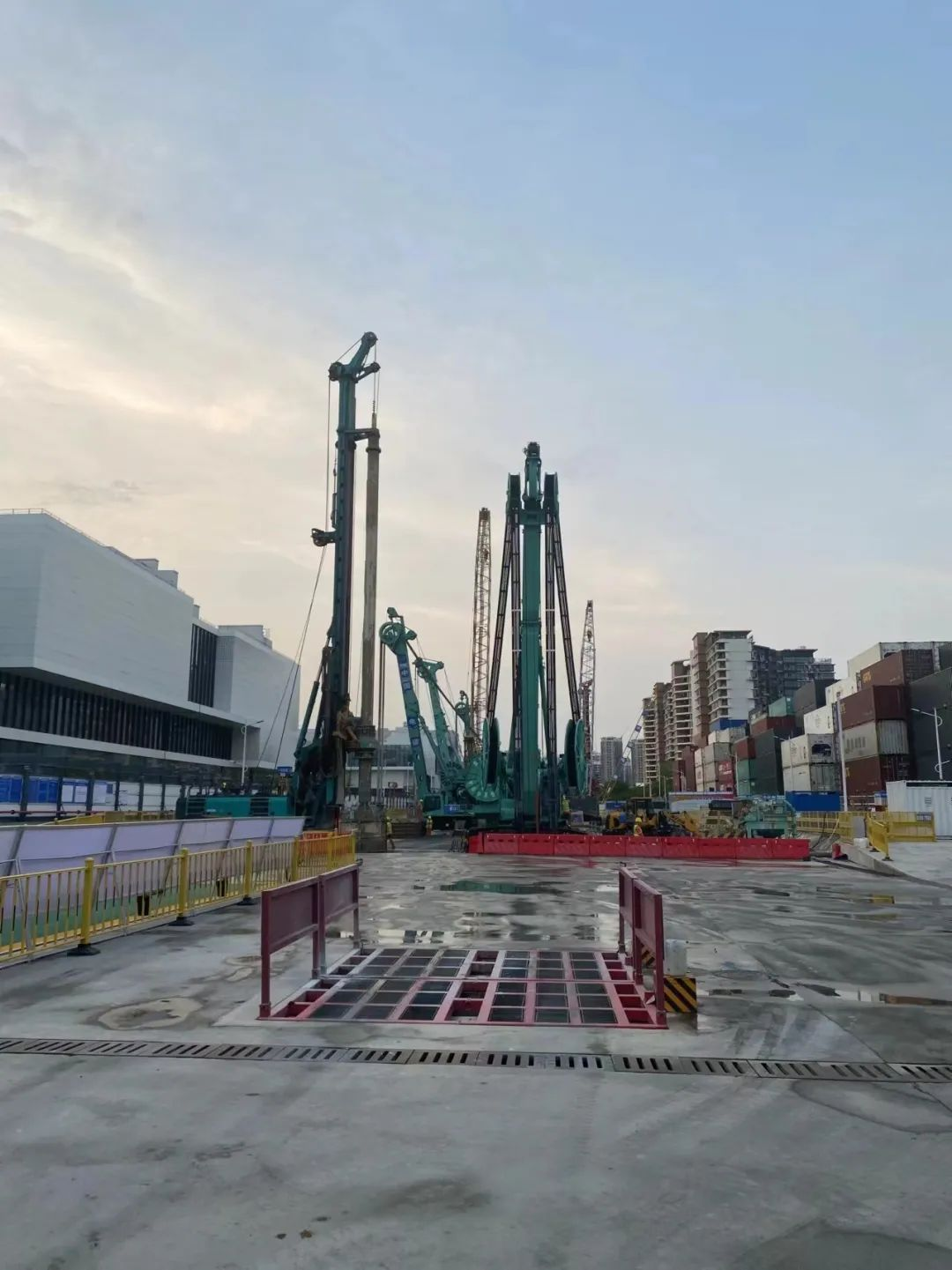在深圳市城市轨道交通15号线的重要节点——铲湾北站,其围护结构的施工已经步入了尾声阶段。现场呈现出一派繁忙而有序的景象,多台金泰双轮铣、抓斗等大型设备轰鸣作响,共同绘制出一幅风风火火、紧张有序的施工画卷。