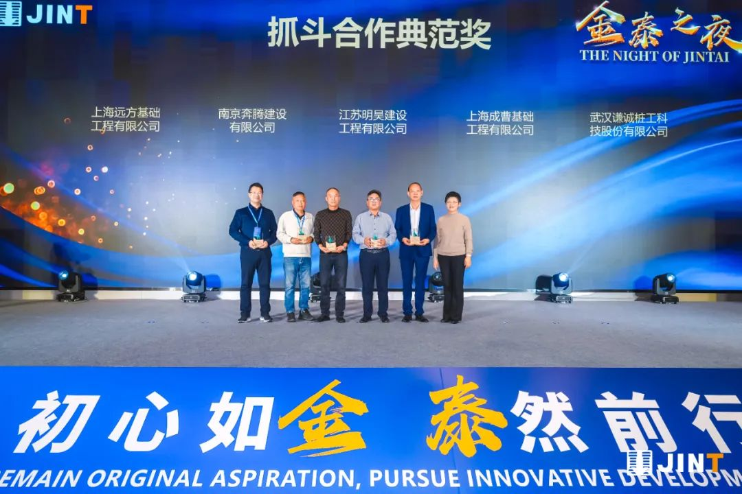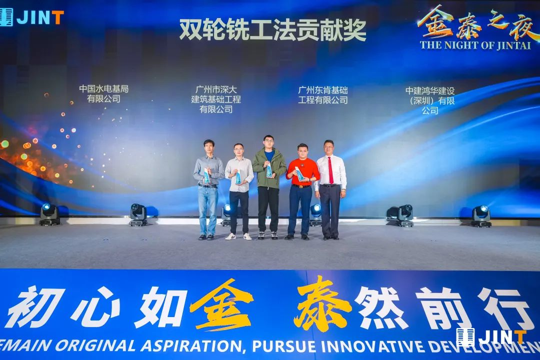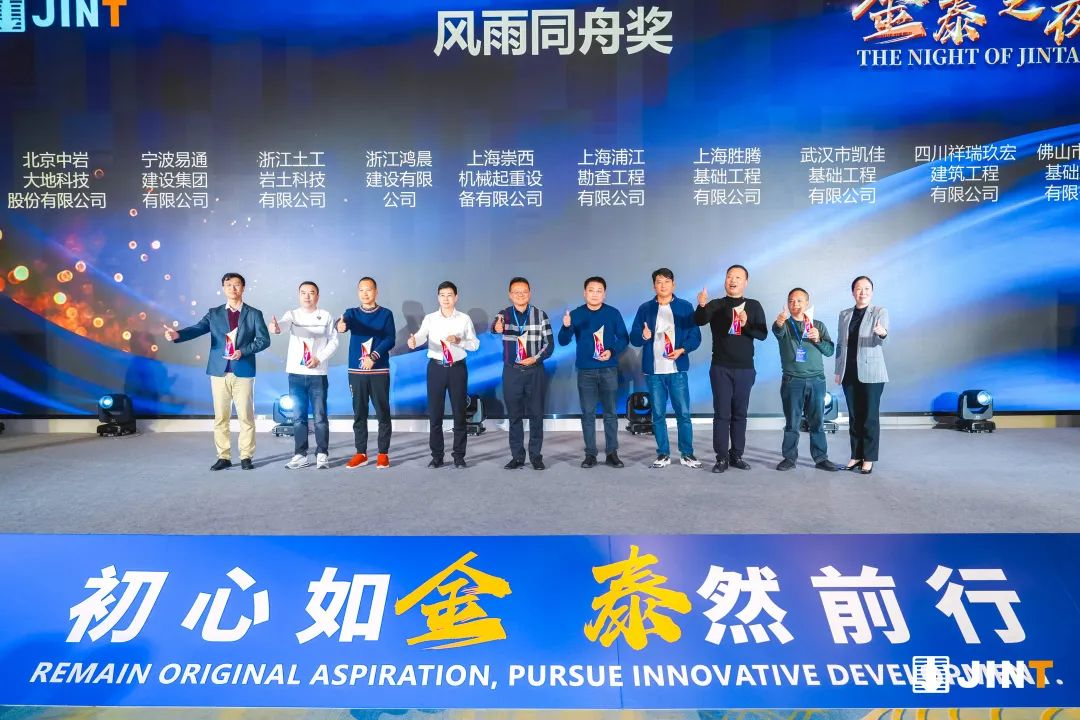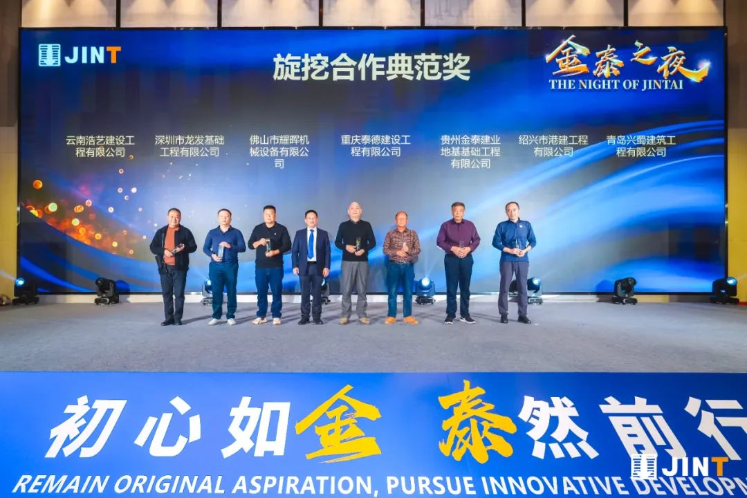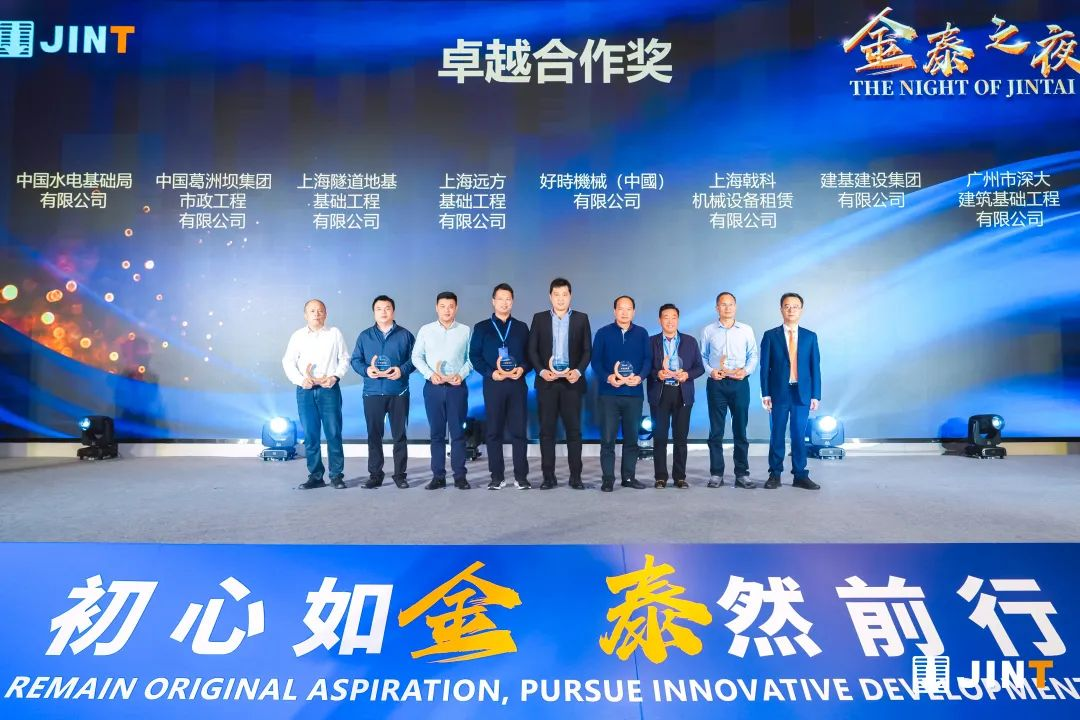 在“金泰之夜”答谢晚宴开始前,袁世国董事长、丁静羽副董事长、金泰经营团队为与金泰保持长期良好合作,对金泰产品和技术进步起到重要推动作用的行业客户、专业客户颁发了卓越合作奖、风雨同舟奖、抓斗合作奖、旋挖合作奖、CSM工法贡献奖、双轮铣贡献奖等6大类共41个奖项。
